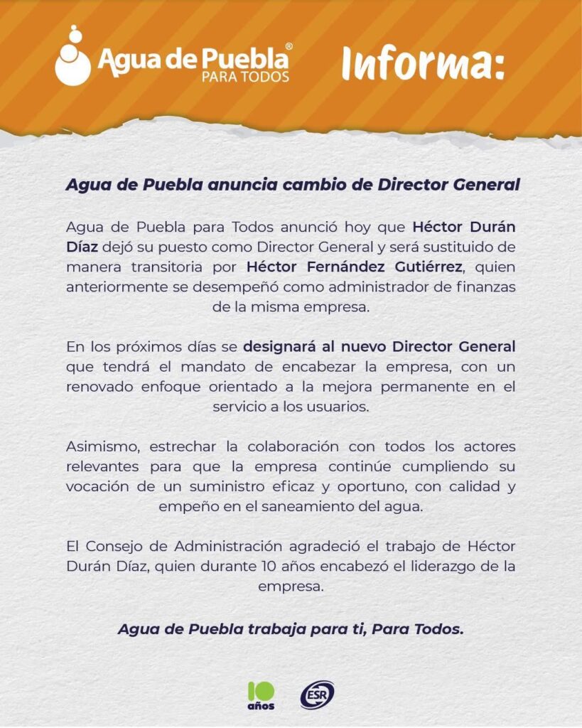 Héctor Durán Díaz renunció al cargo de director general de Agua de Puebla Para Todos, empresa que ha sido en los últimos meses criticada por los cortes y mal servicio que presta, además de excesos en sus tarifas.