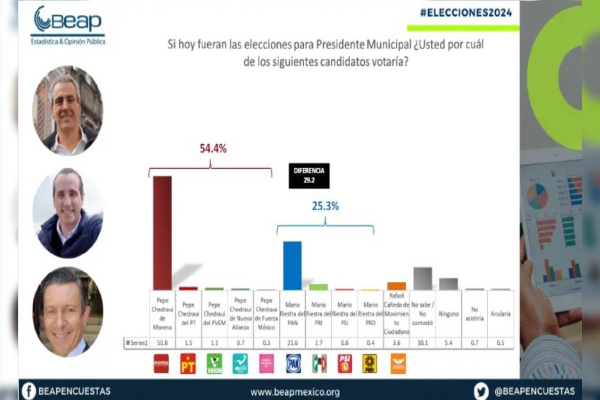 Pepe Chedraui, candidato a la Presidencia Municipal de Puebla por Morena y sus aliados, encabeza las preferencias ciudadanas con una ventaja significativa de 29.2 puntos, según los últimos resultados de la encuestadora Buró de Estadística y Análisis de Opinión Pública (Beap). A unos días de las elecciones, la encuesta realizada por Beap revela que Chedraui […]