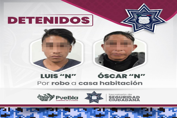 La Secretaría de Seguridad Ciudadana (SSC) detuvo a Óscar “N.” y Luis “N”, por su presunta participación en el robo a una casa habitación al suroriente de la capital poblana, los señalados cuentan con antecedentes penales. Los hechos se registraron en la zona de San Francisco Totimehuacán, donde policías municipales fueron alertados a través de […]