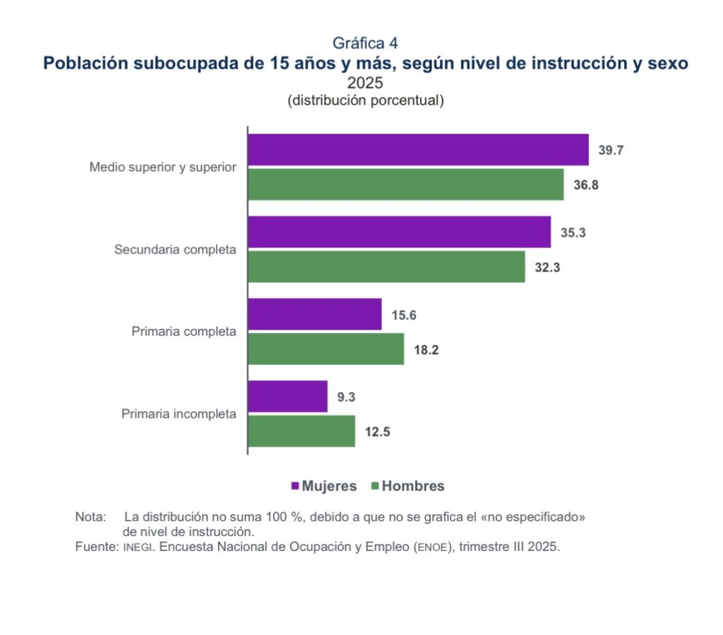 Ahora bien. No todo está mal: el siguiente resultado es favorable: Entre 2015 y 2025, la proporción de mujeres de 15 años y más que tenía estudios de nivel medio superior y superior aumentó de 27.2 a 38.3 %. Se observa que, en 2015, 17.0 % tenía estudios de primaria incompleta, en contraste con la reducción a 11.7 % en 2025.