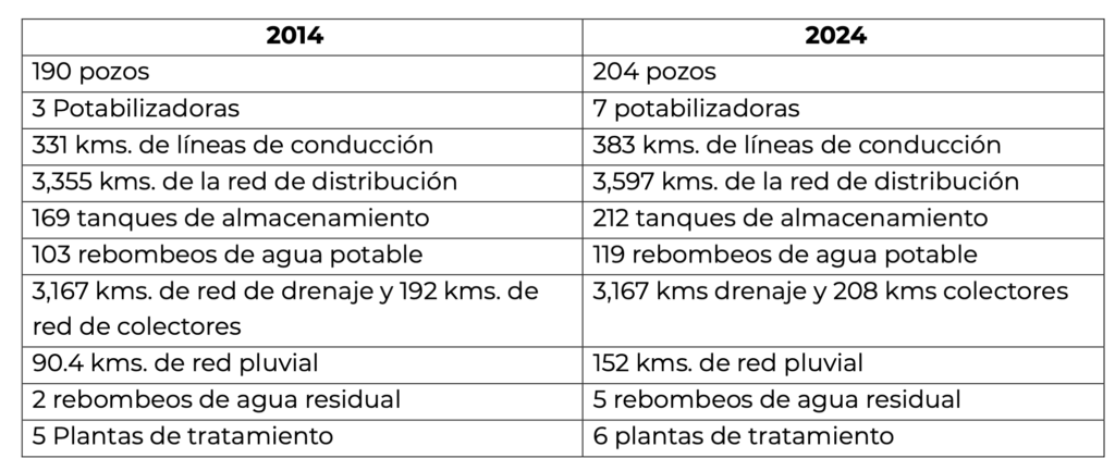 Con la operación de 5 plantas potabilizadoras se ha mejorado sustancialmente la calidad del agua, gracias a las tecnologías de ósmosis inversa, ablandamiento de agua e intercambio iónico, cumpliendo con la normativa NOM-127-SSA1. Asimismo, se realizan muestreos anuales pasando de 209 en el año 2014 a 509 en el 2023.