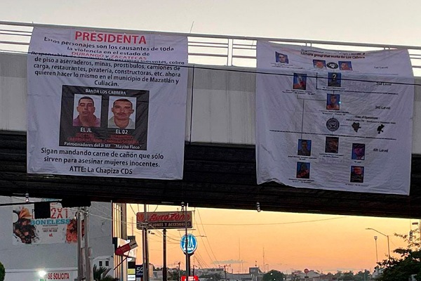 Una serie de mantas, con mensajes dirigidos a la presidente Claudia Sheinbaum, fueron colocadas este 3 de septiembre en distintos puentes ubicados en la ciudad de Culiacán, Sinaloa. En letras rojas se logra leer “PRESIDENTA”, seguido de un texto presuntamente firmado por “La Chapiza CDS” en donde acusan a los hermanos José Luis y Alejandro Cabrera Sarabia […]