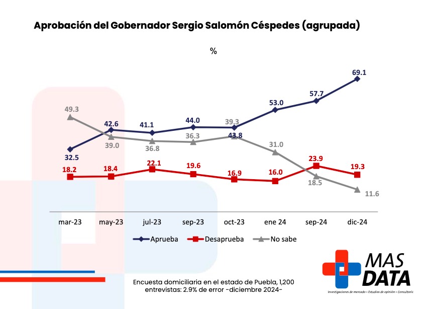A su vez, según el estudio aplicado del 29 de noviembre al 3 de diciembre, 69% de los encuestados estima que el trabajo de Sergio Salomón está aprobado entre mucho y poco, con únicamente 12% que no sabe qué responder.