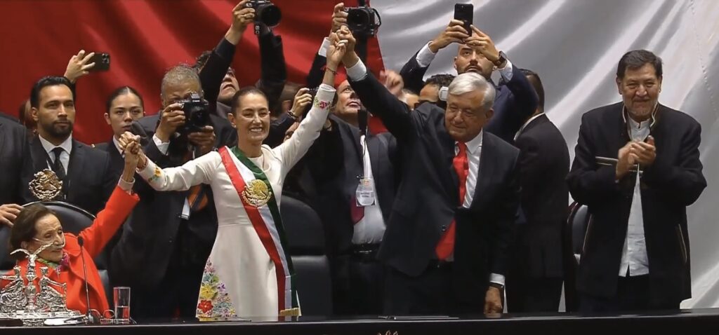 En la sede del Congreso de la Unión le fue colocada la Banda Presidencial por la primera candidata presidencial del país, Ifigenia Martínez en presencia del presidente saliente, Andrés Manuel López Obrador.