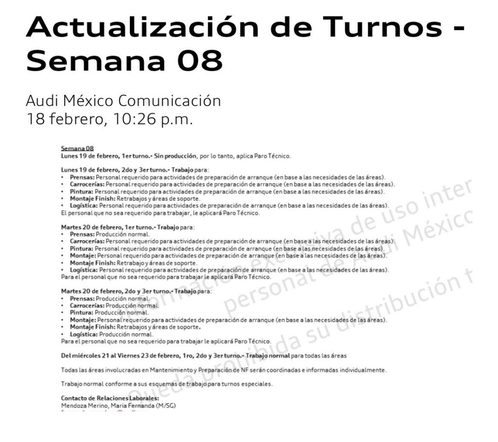 Audi México informó que el acuerdo sobre el Contrato Colectivo de Trabajo 2024 fue aprobado por la mayoría de las y los colaboradores, a través de una votación conforme a los marcos normativos establecidos.