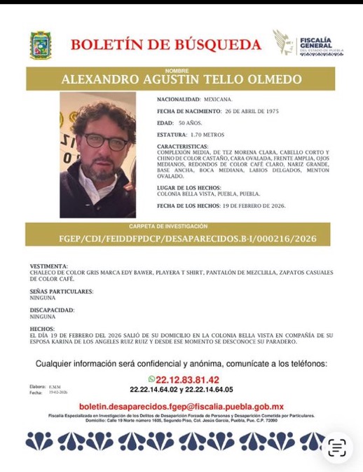 Karina ya fue boletinada por el Protocolo Alba y Alexandro cuenta con ficha de búsqueda por parte de la Fiscalía General del Estado de Puebla, ambos cuentan con 50 años de edad.