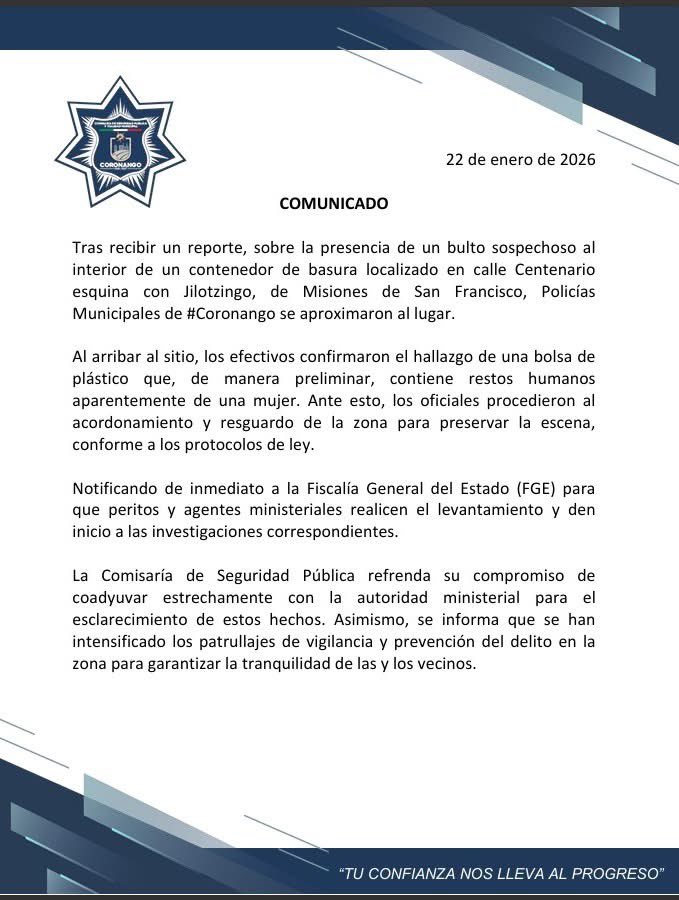 La mañana de este jueves, personal del servicio de limpia municipal localizó restos humanos de una persona al interior de un contenedor de basura, en la Sección 9 del fraccionamiento Misiones de San Francisco, en el municipio de Coronango.