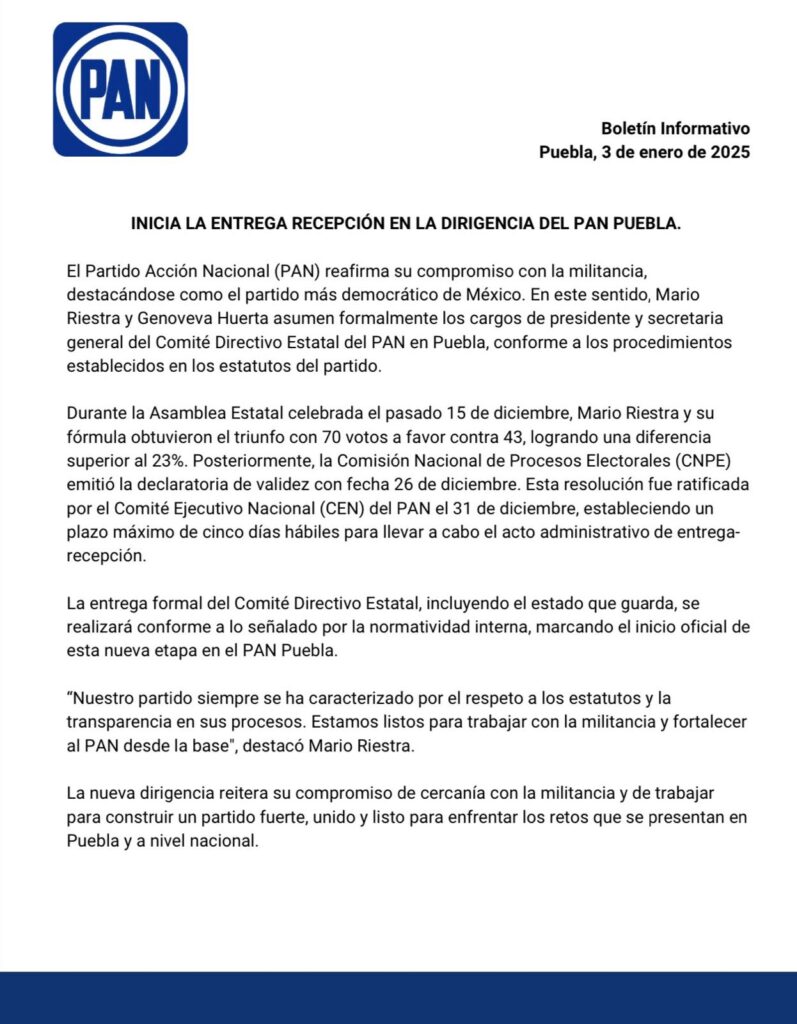 La entrega formal del Comité Directivo Estatal, incluyendo el estado que guarda, se realizará conforme a lo señalado por la normatividad interna, marcando el inicio oficial de esta nueva etapa en el PAN Puebla.