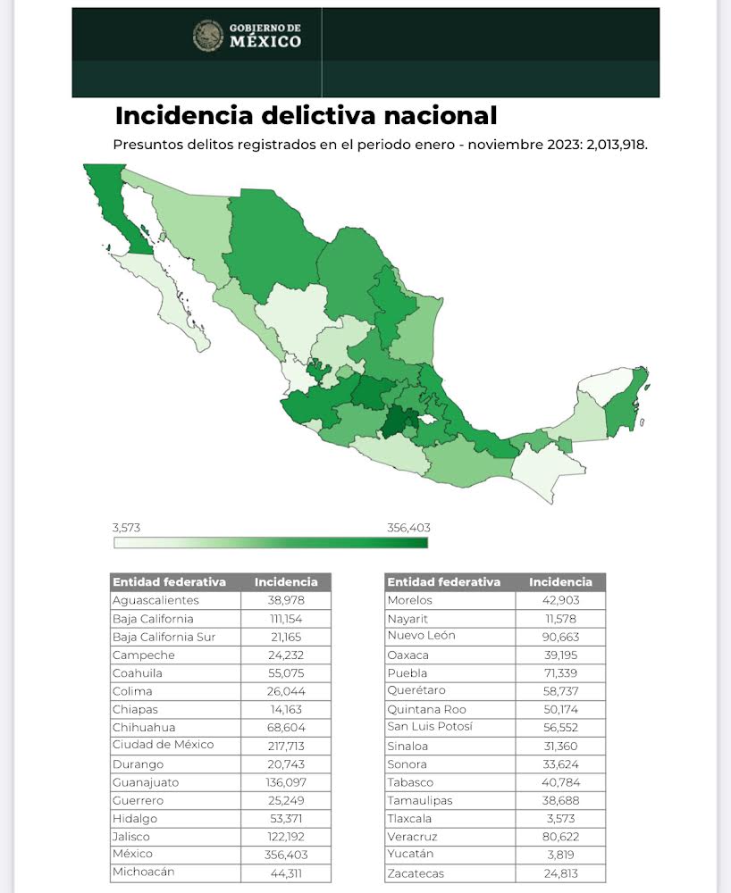La incidencia nacional de delitos registra de enero a noviembre registra casi 2 millones 14 mil hechos.