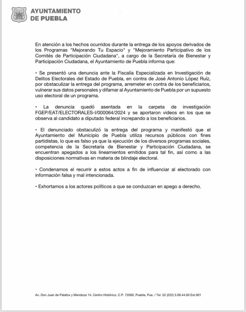 A través de un comunicado el gobierno municipal informó que presentaron una denuncia ante la Fiscalía Especializada en Investigación de Delitos Electorales del Estado de Puebla, en contra de José Antonio López Ruiz, por obstaculizar la entrega del programa.
