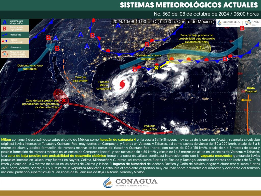 A esto se suman rachas de 120 a 150 kilómetros por hora, oleaje de 4 a 6 metros de altura y posible formación de trombas marinas en costas de Campeche, al norte, y Quintana Roo, igual al norte.
